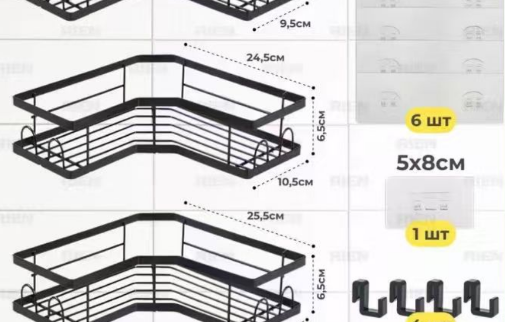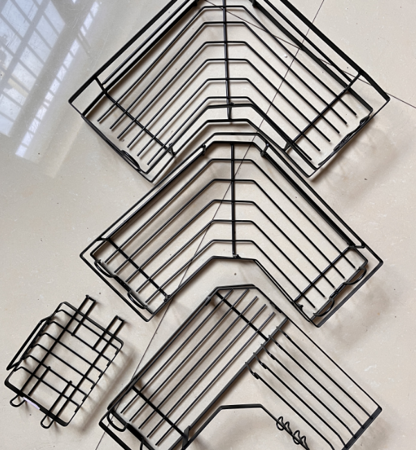 Made of Powder Coated Iron Wire,Matte Black,White,or 201 Stainless Steel Wire,Polished Bright Color or Matte Black Color Opitonal Small Rack Size: 22.5×22.5x6cm Medium Rack Size: 24x24x6.0cm Big Rack Size:25x25x7.0cm Soap Tray:16×9.5×5.0cm x 1 Unit pack size: 26×25.5x8cm N.W.: 1.136kgs G.W. 1.286kgs Master carton size:59x27x54.5cm, 16pcs/Carton, G.W.:18.54kgs With 6 x hooks With 2x utensil holders